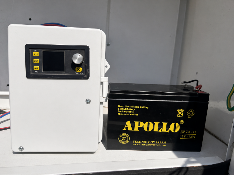 Từ tấm solar đi qua charge controller được nạp vào ắc quy , điện từ ắc quy đi vào bộ điều khiển rồi đi xuống lưới titan MMO ( anode )